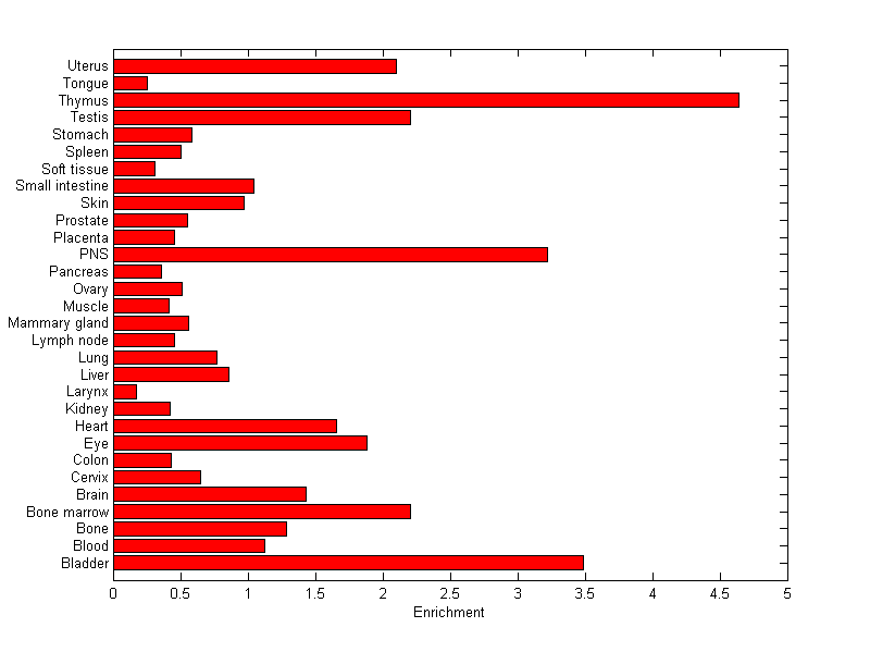 The expression level is normalized with tissue-library size. Each value for a gene in a tissue is a ratio of observed ESTs to the expected one in this tissue. The expected number of ESTs is the product of total ESTs of the gene and the fraction of total ESTs in the tissue among all ESTs in 30 tissues.