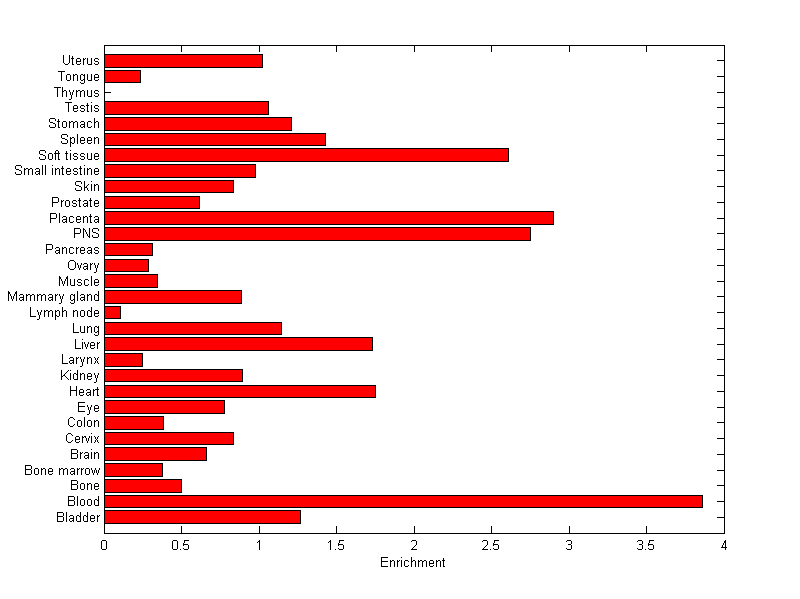 The expression level is normalized with tissue-library size. Each value for a gene in a tissue is a ratio of observed ESTs to the expected one in this tissue. The expected number of ESTs is the product of total ESTs of the gene and the fraction of total ESTs in the tissue among all ESTs in 30 tissues.