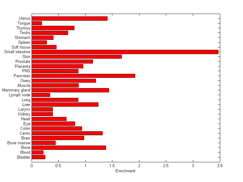 The expression level is normalized with tissue-library size. Each value for a gene in a tissue is a ratio of observed ESTs to the expected one in this tissue. The expected number of ESTs is the product of total ESTs of the gene and the fraction of total ESTs in the tissue among all ESTs in 30 tissues.