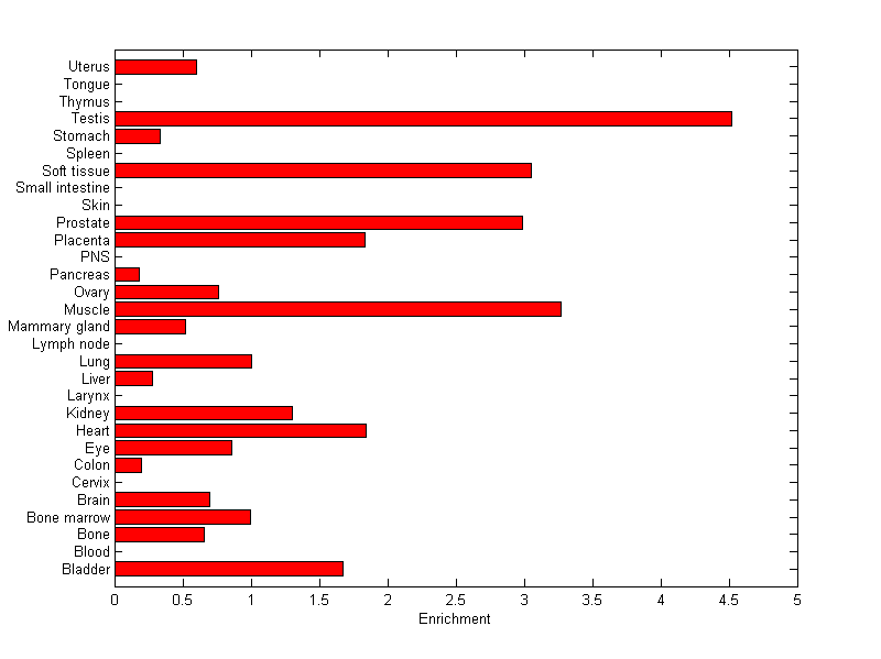 The expression level is normalized with tissue-library size. Each value for a gene in a tissue is a ratio of observed ESTs to the expected one in this tissue. The expected number of ESTs is the product of total ESTs of the gene and the fraction of total ESTs in the tissue among all ESTs in 30 tissues.