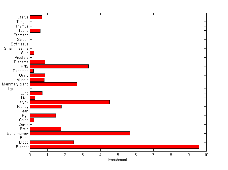 About the profile: The expression level is normalized with tissue-library size. Each value for a gene in a tissue is a ratio of observed ESTs to the expected one in this tissue. The expected number of ESTs is the product of total ESTs of the gene and the fraction of total ESTs in the tissue among all ESTs in 30 tissues. Summary: This gene is preferentially expressed in [bladder] Download: |