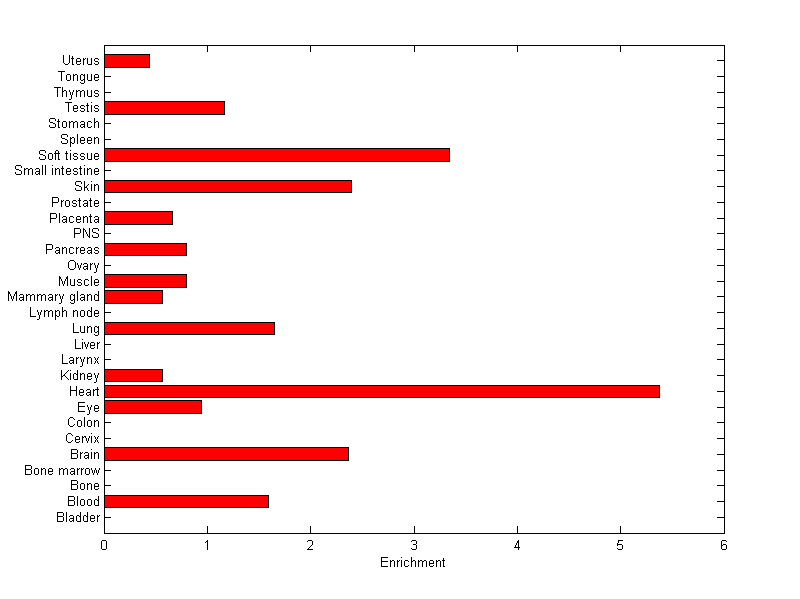 The expression level is normalized with tissue-library size. Each value for a gene in a tissue is a ratio of observed ESTs to the expected one in this tissue. The expected number of ESTs is the product of total ESTs of the gene and the fraction of total ESTs in the tissue among all ESTs in 30 tissues.