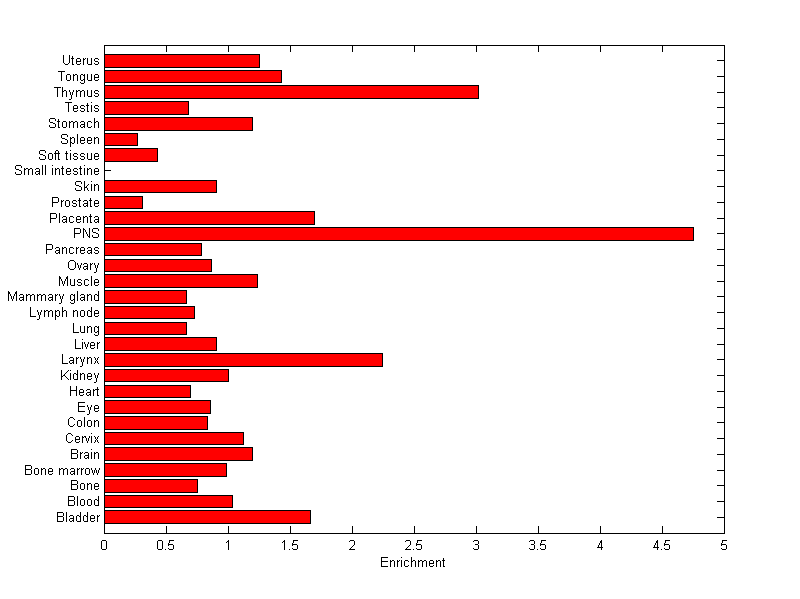 The expression level is normalized with tissue-library size. Each value for a gene in a tissue is a ratio of observed ESTs to the expected one in this tissue. The expected number of ESTs is the product of total ESTs of the gene and the fraction of total ESTs in the tissue among all ESTs in 30 tissues.