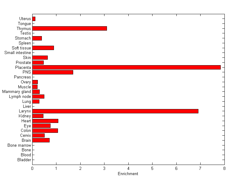 About the profile: The expression level is normalized with tissue-library size. Each value for a gene in a tissue is a ratio of observed ESTs to the expected one in this tissue. The expected number of ESTs is the product of total ESTs of the gene and the fraction of total ESTs in the tissue among all ESTs in 30 tissues. Summary: This gene is preferentially expressed in [larynx, placenta] Download: |