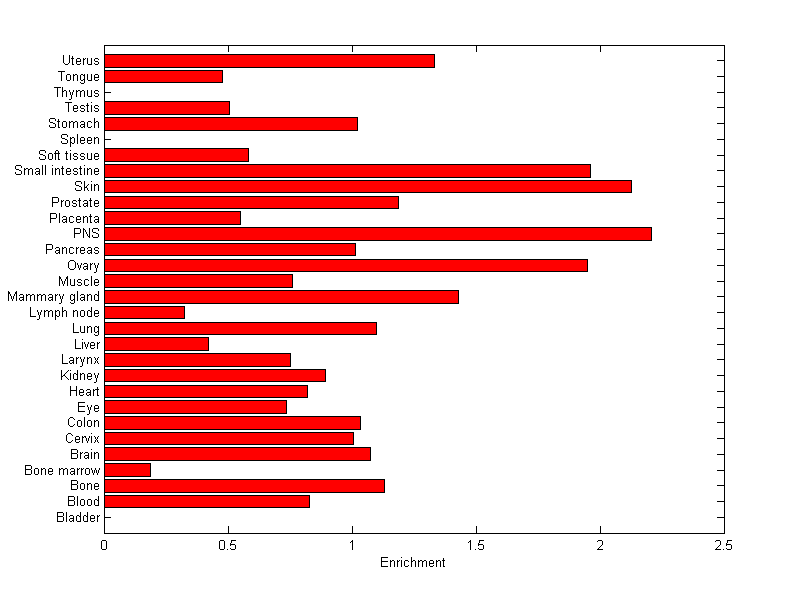The expression level is normalized with tissue-library size. Each value for a gene in a tissue is a ratio of observed ESTs to the expected one in this tissue. The expected number of ESTs is the product of total ESTs of the gene and the fraction of total ESTs in the tissue among all ESTs in 30 tissues.