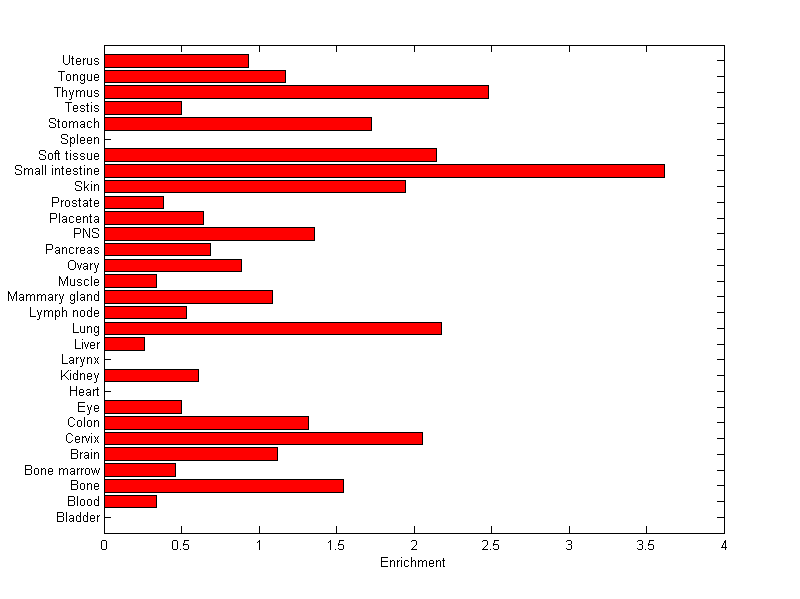The expression level is normalized with tissue-library size. Each value for a gene in a tissue is a ratio of observed ESTs to the expected one in this tissue. The expected number of ESTs is the product of total ESTs of the gene and the fraction of total ESTs in the tissue among all ESTs in 30 tissues.