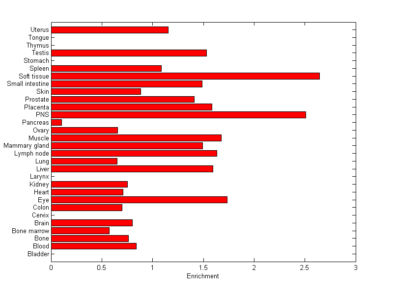 The expression level is normalized with tissue-library size. Each value for a gene in a tissue is a ratio of observed ESTs to the expected one in this tissue. The expected number of ESTs is the product of total ESTs of the gene and the fraction of total ESTs in the tissue among all ESTs in 30 tissues.