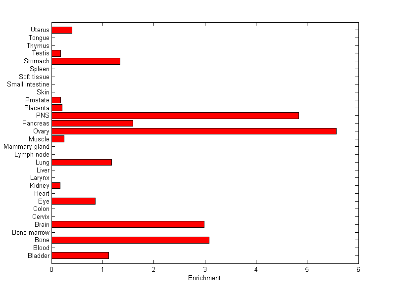 About the profile: The expression level is normalized with tissue-library size. Each value for a gene in a tissue is a ratio of observed ESTs to the expected one in this tissue. The expected number of ESTs is the product of total ESTs of the gene and the fraction of total ESTs in the tissue among all ESTs in 30 tissues. Summary: This gene is preferentially expressed in [ovary] Download: |