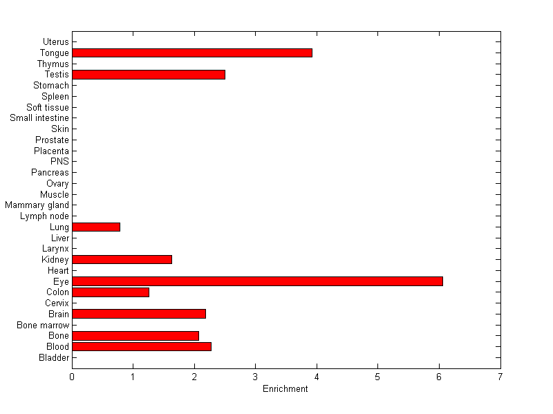 The expression level is normalized with tissue-library size. Each value for a gene in a tissue is a ratio of observed ESTs to the expected one in this tissue. The expected number of ESTs is the product of total ESTs of the gene and the fraction of total ESTs in the tissue among all ESTs in 30 tissues.