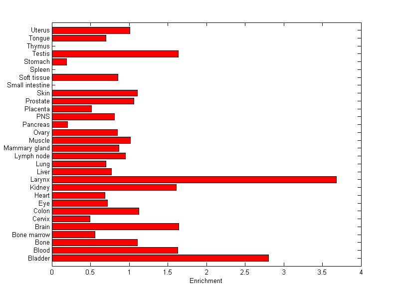 The expression level is normalized with tissue-library size. Each value for a gene in a tissue is a ratio of observed ESTs to the expected one in this tissue. The expected number of ESTs is the product of total ESTs of the gene and the fraction of total ESTs in the tissue among all ESTs in 30 tissues.
