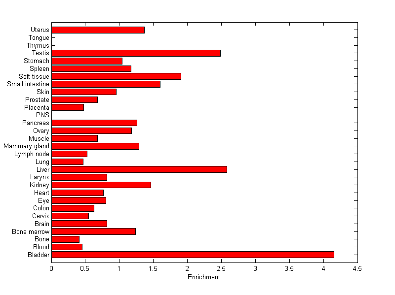 The expression level is normalized with tissue-library size. Each value for a gene in a tissue is a ratio of observed ESTs to the expected one in this tissue. The expected number of ESTs is the product of total ESTs of the gene and the fraction of total ESTs in the tissue among all ESTs in 30 tissues.