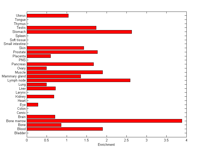 The expression level is normalized with tissue-library size. Each value for a gene in a tissue is a ratio of observed ESTs to the expected one in this tissue. The expected number of ESTs is the product of total ESTs of the gene and the fraction of total ESTs in the tissue among all ESTs in 30 tissues.