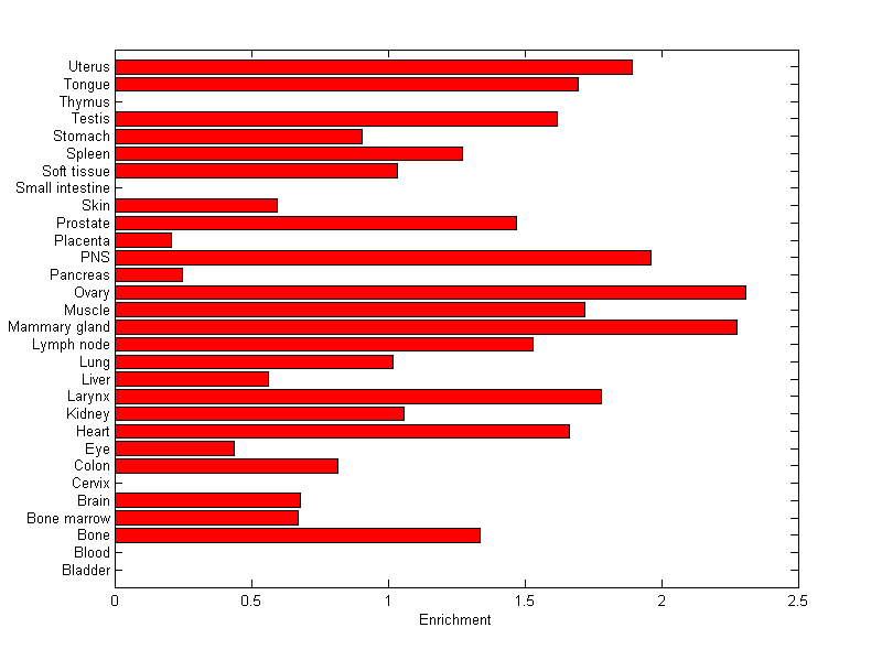 The expression level is normalized with tissue-library size. Each value for a gene in a tissue is a ratio of observed ESTs to the expected one in this tissue. The expected number of ESTs is the product of total ESTs of the gene and the fraction of total ESTs in the tissue among all ESTs in 30 tissues.