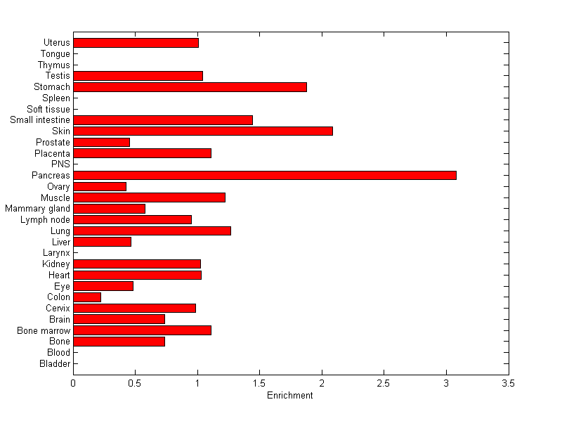 The expression level is normalized with tissue-library size. Each value for a gene in a tissue is a ratio of observed ESTs to the expected one in this tissue. The expected number of ESTs is the product of total ESTs of the gene and the fraction of total ESTs in the tissue among all ESTs in 30 tissues.