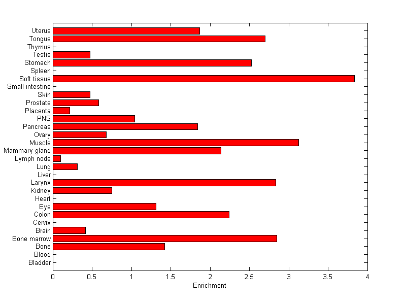 The expression level is normalized with tissue-library size. Each value for a gene in a tissue is a ratio of observed ESTs to the expected one in this tissue. The expected number of ESTs is the product of total ESTs of the gene and the fraction of total ESTs in the tissue among all ESTs in 30 tissues.