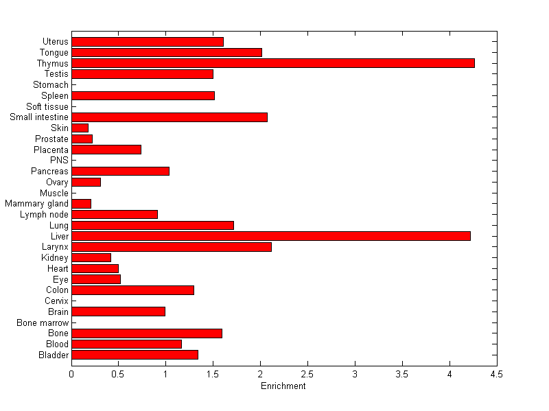 The expression level is normalized with tissue-library size. Each value for a gene in a tissue is a ratio of observed ESTs to the expected one in this tissue. The expected number of ESTs is the product of total ESTs of the gene and the fraction of total ESTs in the tissue among all ESTs in 30 tissues.