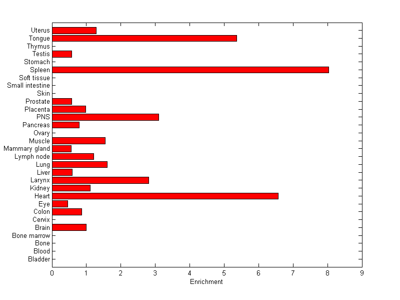 The expression level is normalized with tissue-library size. Each value for a gene in a tissue is a ratio of observed ESTs to the expected one in this tissue. The expected number of ESTs is the product of total ESTs of the gene and the fraction of total ESTs in the tissue among all ESTs in 30 tissues.