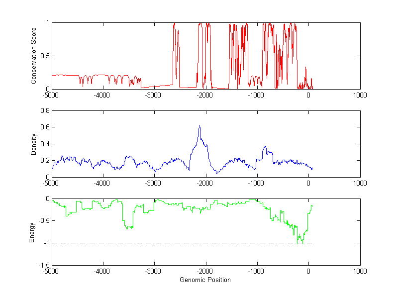 The energy profile (green curve) is about energy for module detection based on TF interaction. The positions with energy less than -1 indicate the existence of CRMs.