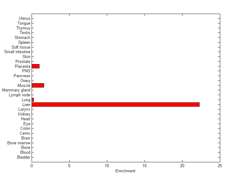 The expression level is normalized with tissue-library size. Each value for a gene in a tissue is a ratio of observed ESTs to the expected one in this tissue. The expected number of ESTs is the product of total ESTs of the gene and the fraction of total ESTs in the tissue among all ESTs in 30 tissues.