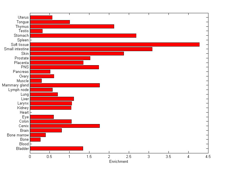 The expression level is normalized with tissue-library size. Each value for a gene in a tissue is a ratio of observed ESTs to the expected one in this tissue. The expected number of ESTs is the product of total ESTs of the gene and the fraction of total ESTs in the tissue among all ESTs in 30 tissues.