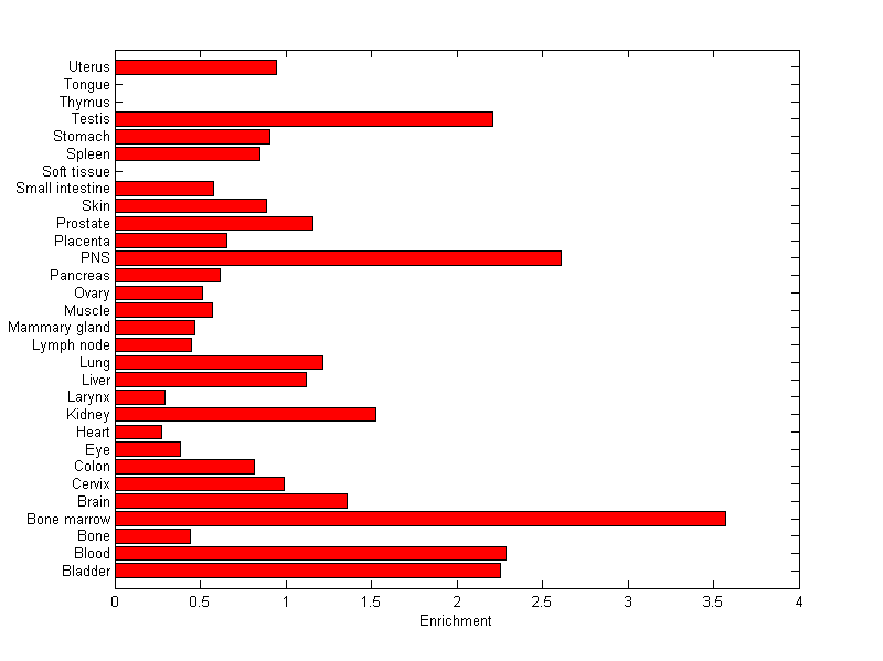 The expression level is normalized with tissue-library size. Each value for a gene in a tissue is a ratio of observed ESTs to the expected one in this tissue. The expected number of ESTs is the product of total ESTs of the gene and the fraction of total ESTs in the tissue among all ESTs in 30 tissues.
