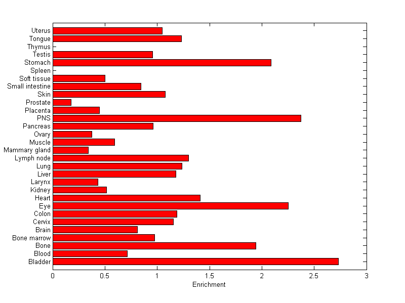 The expression level is normalized with tissue-library size. Each value for a gene in a tissue is a ratio of observed ESTs to the expected one in this tissue. The expected number of ESTs is the product of total ESTs of the gene and the fraction of total ESTs in the tissue among all ESTs in 30 tissues.
