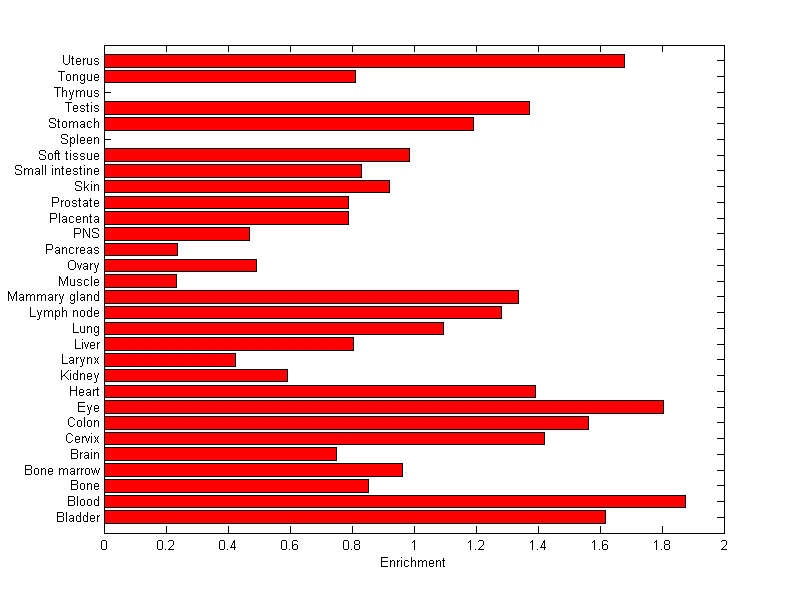 The expression level is normalized with tissue-library size. Each value for a gene in a tissue is a ratio of observed ESTs to the expected one in this tissue. The expected number of ESTs is the product of total ESTs of the gene and the fraction of total ESTs in the tissue among all ESTs in 30 tissues.