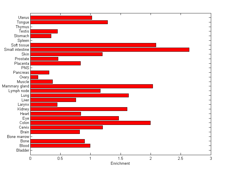 The expression level is normalized with tissue-library size. Each value for a gene in a tissue is a ratio of observed ESTs to the expected one in this tissue. The expected number of ESTs is the product of total ESTs of the gene and the fraction of total ESTs in the tissue among all ESTs in 30 tissues.