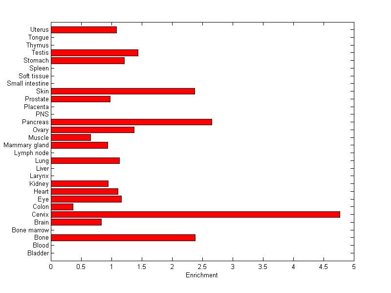 The expression level is normalized with tissue-library size. Each value for a gene in a tissue is a ratio of observed ESTs to the expected one in this tissue. The expected number of ESTs is the product of total ESTs of the gene and the fraction of total ESTs in the tissue among all ESTs in 30 tissues.