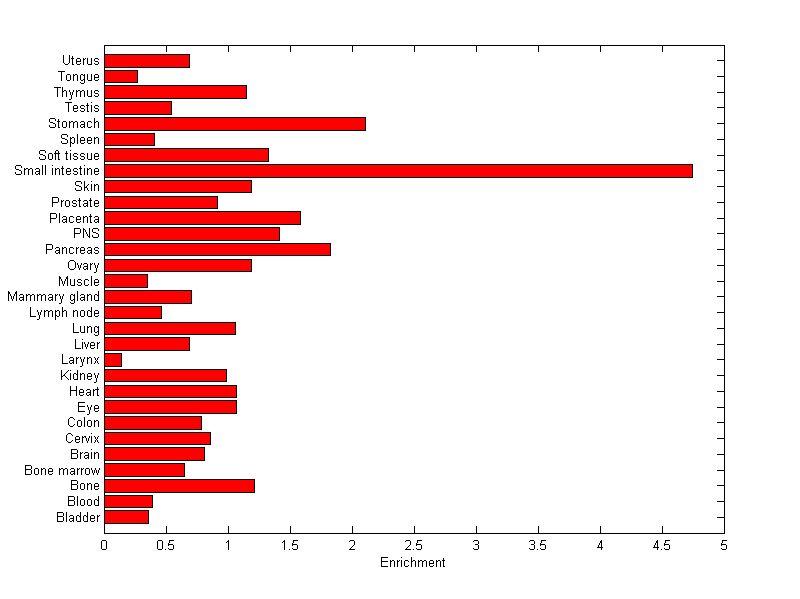 The expression level is normalized with tissue-library size. Each value for a gene in a tissue is a ratio of observed ESTs to the expected one in this tissue. The expected number of ESTs is the product of total ESTs of the gene and the fraction of total ESTs in the tissue among all ESTs in 30 tissues.