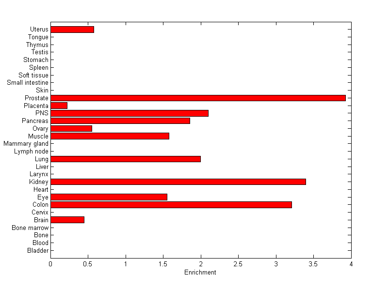 The expression level is normalized with tissue-library size. Each value for a gene in a tissue is a ratio of observed ESTs to the expected one in this tissue. The expected number of ESTs is the product of total ESTs of the gene and the fraction of total ESTs in the tissue among all ESTs in 30 tissues.