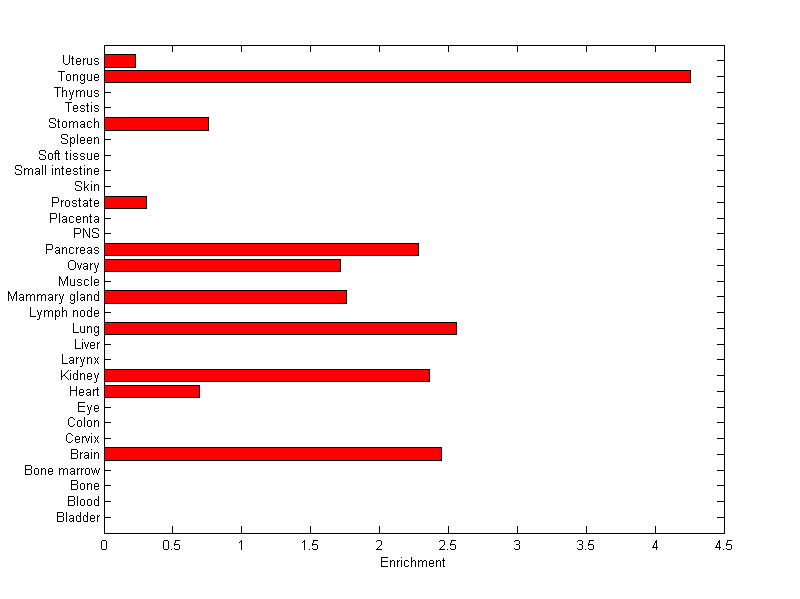 The expression level is normalized with tissue-library size. Each value for a gene in a tissue is a ratio of observed ESTs to the expected one in this tissue. The expected number of ESTs is the product of total ESTs of the gene and the fraction of total ESTs in the tissue among all ESTs in 30 tissues.