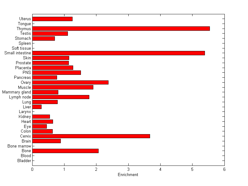 The expression level is normalized with tissue-library size. Each value for a gene in a tissue is a ratio of observed ESTs to the expected one in this tissue. The expected number of ESTs is the product of total ESTs of the gene and the fraction of total ESTs in the tissue among all ESTs in 30 tissues.
