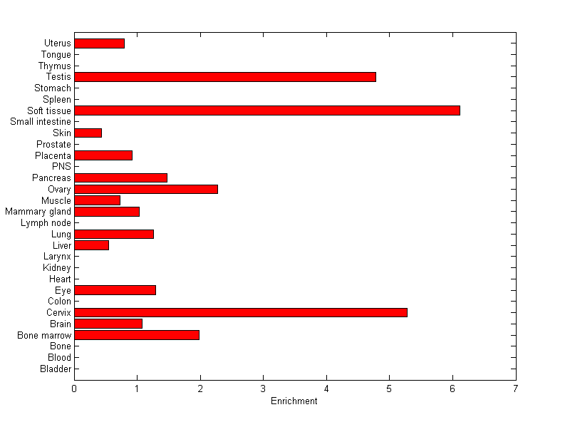 The expression level is normalized with tissue-library size. Each value for a gene in a tissue is a ratio of observed ESTs to the expected one in this tissue. The expected number of ESTs is the product of total ESTs of the gene and the fraction of total ESTs in the tissue among all ESTs in 30 tissues.