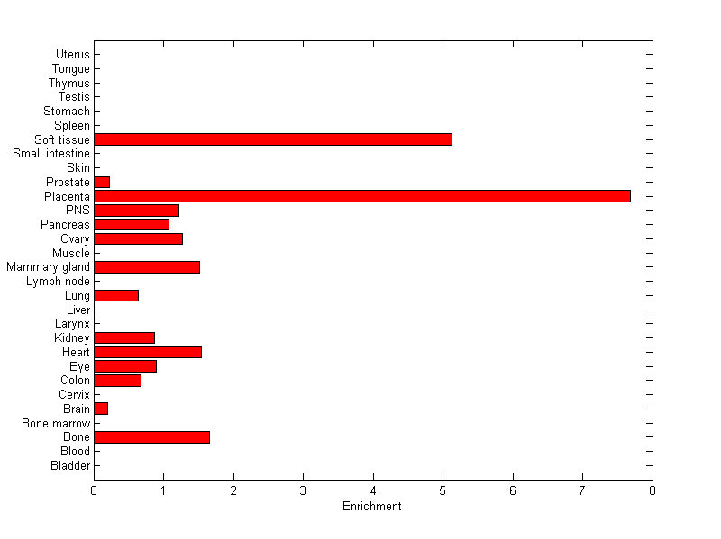 The expression level is normalized with tissue-library size. Each value for a gene in a tissue is a ratio of observed ESTs to the expected one in this tissue. The expected number of ESTs is the product of total ESTs of the gene and the fraction of total ESTs in the tissue among all ESTs in 30 tissues.