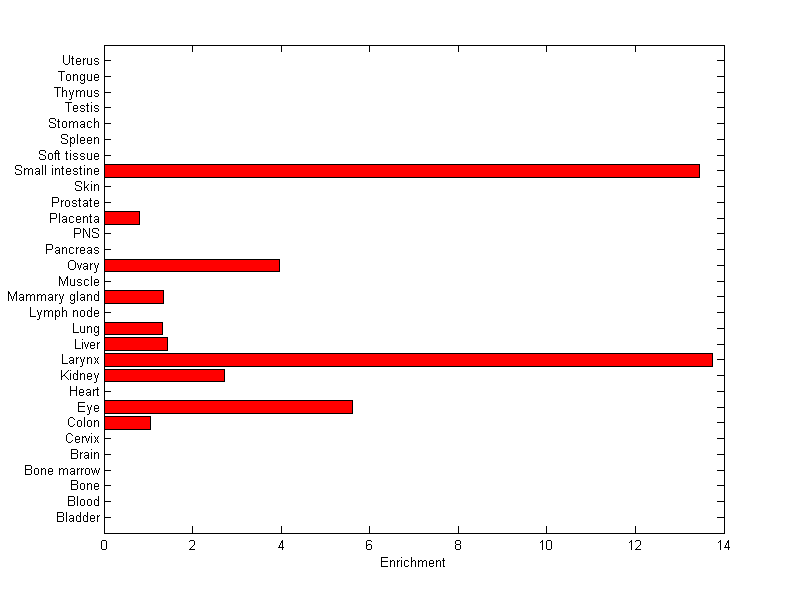 The expression level is normalized with tissue-library size. Each value for a gene in a tissue is a ratio of observed ESTs to the expected one in this tissue. The expected number of ESTs is the product of total ESTs of the gene and the fraction of total ESTs in the tissue among all ESTs in 30 tissues.