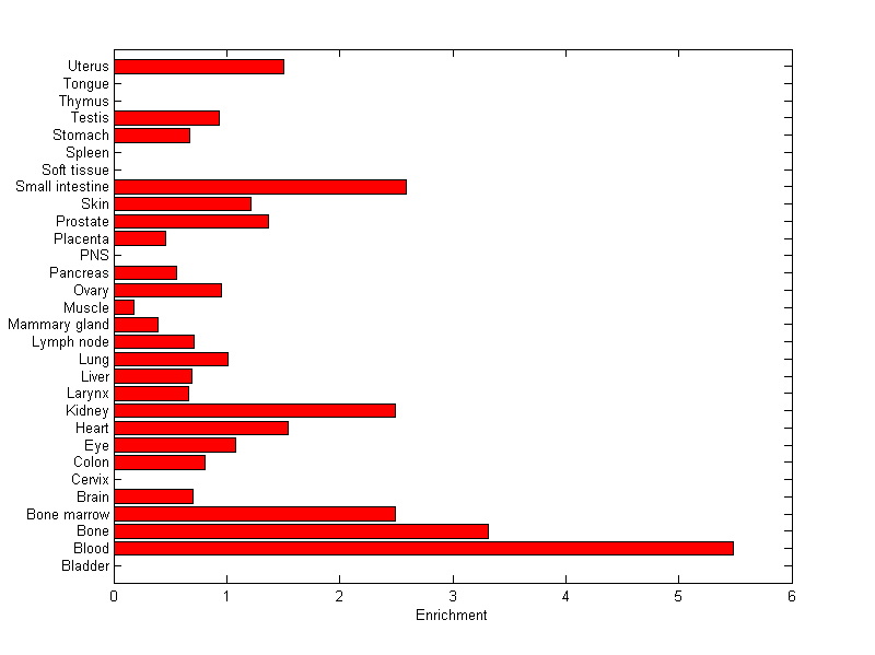 About the profile: The expression level is normalized with tissue-library size. Each value for a gene in a tissue is a ratio of observed ESTs to the expected one in this tissue. The expected number of ESTs is the product of total ESTs of the gene and the fraction of total ESTs in the tissue among all ESTs in 30 tissues. Summary: This gene is preferentially expressed in [blood] Download: |