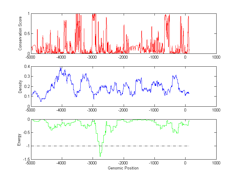 The energy profile (green curve) is about energy for module detection based on TF interaction. The positions with energy less than -1 indicate the existence of CRMs.