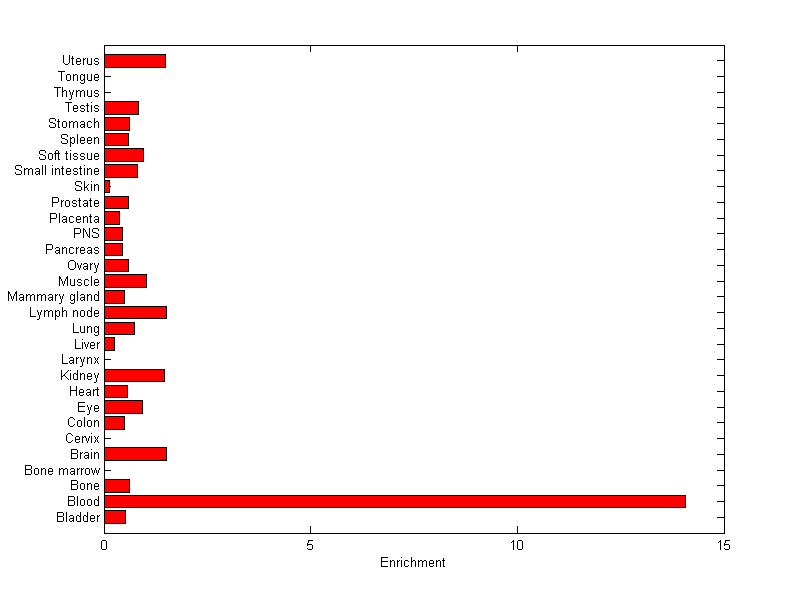 The expression level is normalized with tissue-library size. Each value for a gene in a tissue is a ratio of observed ESTs to the expected one in this tissue. The expected number of ESTs is the product of total ESTs of the gene and the fraction of total ESTs in the tissue among all ESTs in 30 tissues.