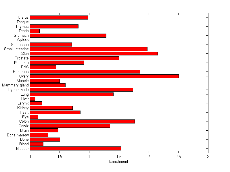 The expression level is normalized with tissue-library size. Each value for a gene in a tissue is a ratio of observed ESTs to the expected one in this tissue. The expected number of ESTs is the product of total ESTs of the gene and the fraction of total ESTs in the tissue among all ESTs in 30 tissues.