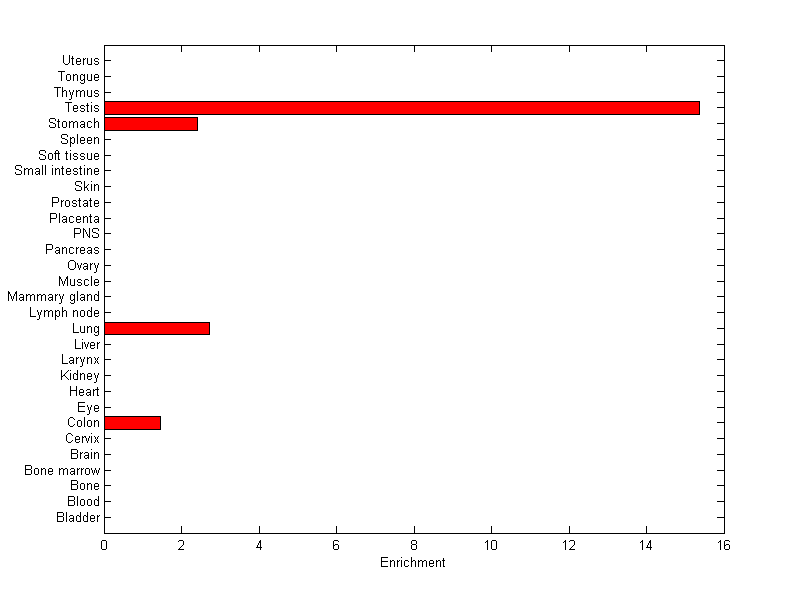 The expression level is normalized with tissue-library size. Each value for a gene in a tissue is a ratio of observed ESTs to the expected one in this tissue. The expected number of ESTs is the product of total ESTs of the gene and the fraction of total ESTs in the tissue among all ESTs in 30 tissues.