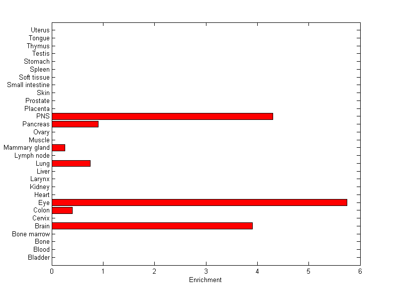The expression level is normalized with tissue-library size. Each value for a gene in a tissue is a ratio of observed ESTs to the expected one in this tissue. The expected number of ESTs is the product of total ESTs of the gene and the fraction of total ESTs in the tissue among all ESTs in 30 tissues.