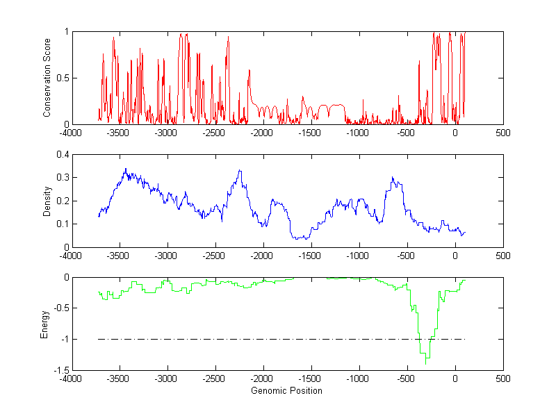 The energy profile (green curve) is about energy for module detection based on TF interaction. The positions with energy less than -1 indicate the existence of CRMs.