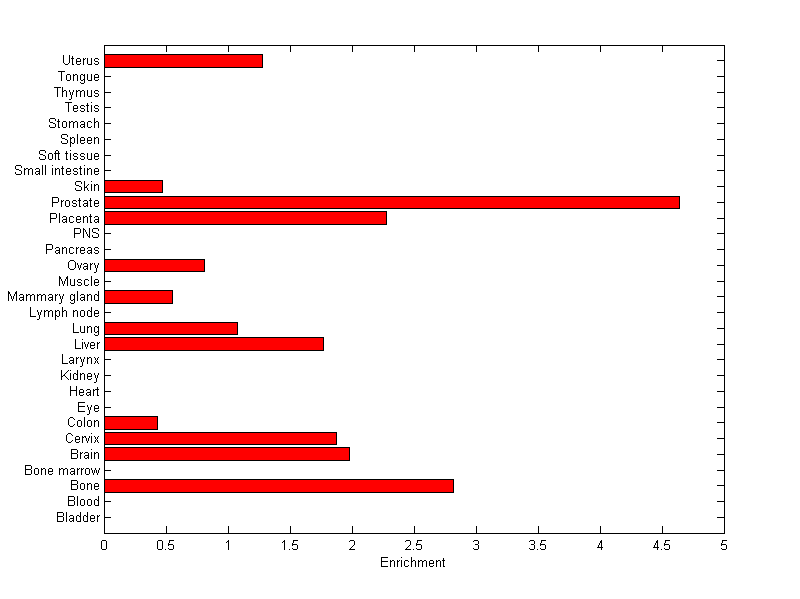The expression level is normalized with tissue-library size. Each value for a gene in a tissue is a ratio of observed ESTs to the expected one in this tissue. The expected number of ESTs is the product of total ESTs of the gene and the fraction of total ESTs in the tissue among all ESTs in 30 tissues.