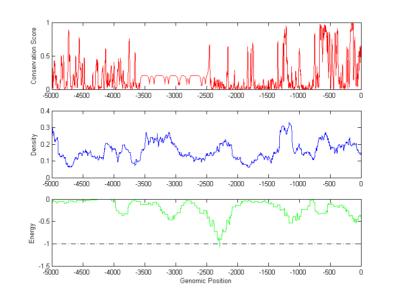 About the profiles: The conservation profile (red curve) is about conservation scores of the promoter sequences. Conservation was determined from an eight-way alignment of human, chimpanzee, dog, mouse, rat, chicken, zebrafish and fugu sequences. The conservation was quantified by a conservation score between 0 and 1, with 1 as highest conservation. The conservation score was obtained from UCSC genome databases. The density profile (blue curve) is about density of all TF binding sites. The energy profile (green curve) is about energy for module detection based on TF interaction. The positions with energy less than -1 indicate the existence of CRMs. Download: Conservation profileDensity profile Energy profile CRM summary |