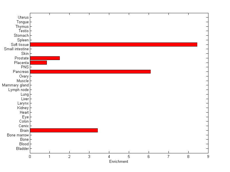 About the profile: The expression level is normalized with tissue-library size. Each value for a gene in a tissue is a ratio of observed ESTs to the expected one in this tissue. The expected number of ESTs is the product of total ESTs of the gene and the fraction of total ESTs in the tissue among all ESTs in 30 tissues. Summary: This gene is preferentially expressed in [pancreas] Download: |