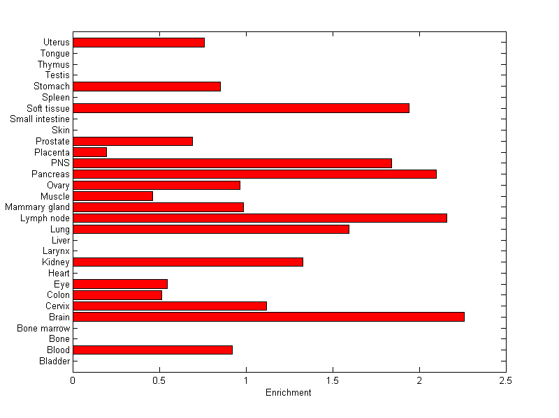 The expression level is normalized with tissue-library size. Each value for a gene in a tissue is a ratio of observed ESTs to the expected one in this tissue. The expected number of ESTs is the product of total ESTs of the gene and the fraction of total ESTs in the tissue among all ESTs in 30 tissues.