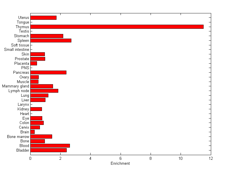 The expression level is normalized with tissue-library size. Each value for a gene in a tissue is a ratio of observed ESTs to the expected one in this tissue. The expected number of ESTs is the product of total ESTs of the gene and the fraction of total ESTs in the tissue among all ESTs in 30 tissues.