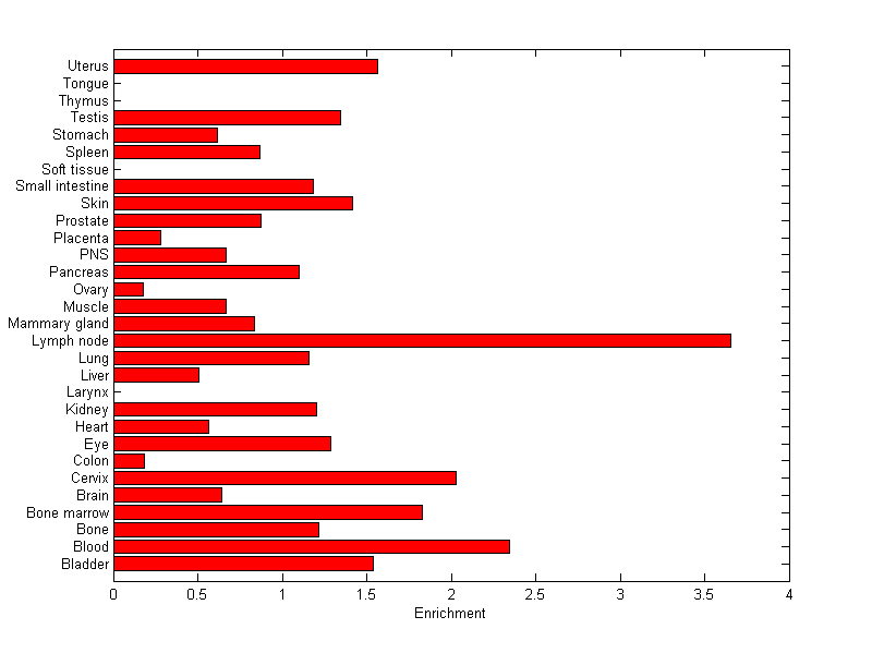 The expression level is normalized with tissue-library size. Each value for a gene in a tissue is a ratio of observed ESTs to the expected one in this tissue. The expected number of ESTs is the product of total ESTs of the gene and the fraction of total ESTs in the tissue among all ESTs in 30 tissues.