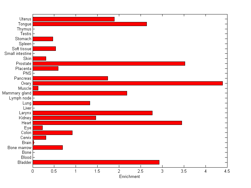 The expression level is normalized with tissue-library size. Each value for a gene in a tissue is a ratio of observed ESTs to the expected one in this tissue. The expected number of ESTs is the product of total ESTs of the gene and the fraction of total ESTs in the tissue among all ESTs in 30 tissues.